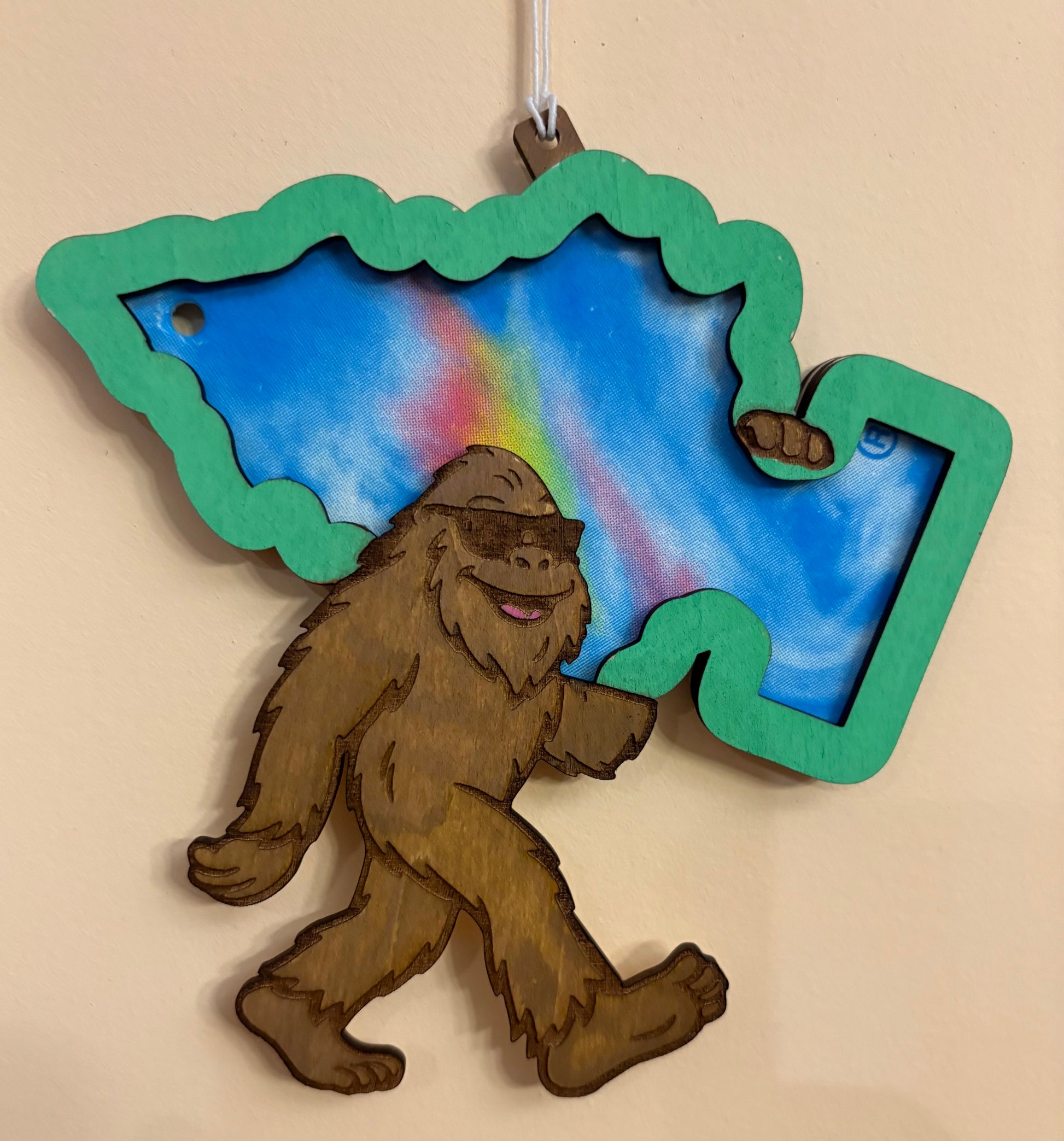 Bring the legend to life (and freshen up your space) with this laser-cut Bigfoot air freshener holder! Designed to fit standard little tree inserts, this wooden Bigfoot carries his pine-tree freshener wherever he roams. Perfect for your car, office, or as a gift for cryptid lovers!
