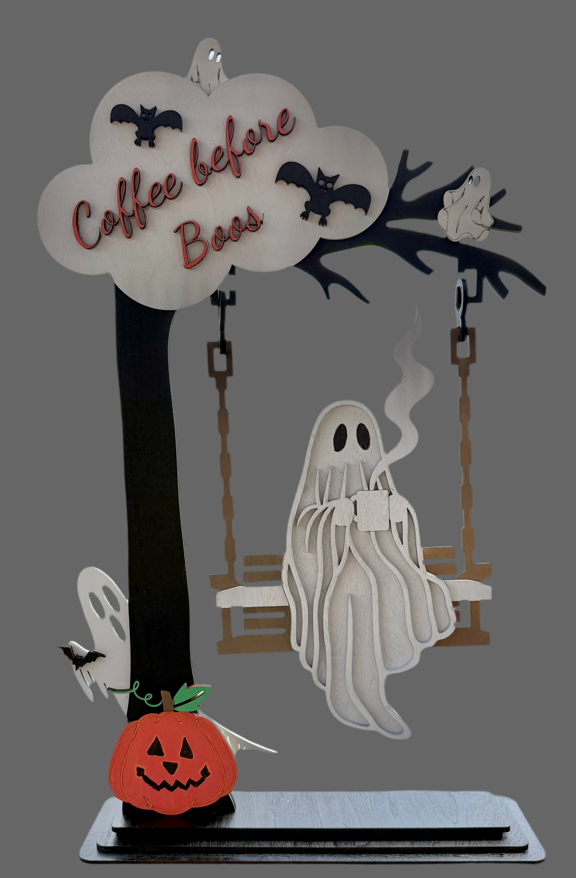 Layered tabletop piece with ghost swinging under a tree, playful “Coffee Before Boos” phrase.